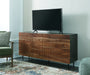 Details Made with sheesham wood, mango wood, veneer and engineered wood, Natural and deep brown finish, Hardware with black finish, 3 doors with soft-close hinges, 2 fixed shelves, Openings in back for electronics, Minor assembly required, simply lay flat and attach feet