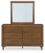 | Details | B615B7: Includes upholstered panel headboard and footboard , Solid wood frame, Due to the use of natural wood materials, some variations may occur , Frame with medium brown wood tone finish, Polyester upholstery, Tapered legs, Foundation/box spring required, sold separately , Mattress available, sold separately, Assembly required, B615B1: Includes dresser and mirror, Made with hardwood solids, mango wood veneer and MDF substrates, Medium brown wood-tone finish, 6 drawers with fully finished interior, dovetail construction and heavy duty ball-bearing side glides, Round tapered legs, Mirror attaches to back of dresser, | |