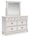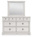 Details PCB823B4: Includes headboard/footboard panels, posts and poster rails , Made with hardwood solids, veneers and MDF substrates , Side rails feature laminated solid hardwood slat support rails (or LVL) with glued and screwed blocking for added strength, Rubbed antiqued white finish , Foundation/box spring required, sold separately, Mattress available, sold separately , Assembly required, PCB823B1: Includes dresser and mirror, Dresser made with hardwood solids, veneers and MDF substrates , Mirror made with solid wood, Rubbed antiqued white finish, Metal hardware with pewter-tone finish, 8 smooth-gliding drawers with fully finished interiors, French/English dovetail construction and heavy-duty ball-bearing side glides, Top drawers felt lined, Mirror attaches to back of dresser, PCB823-93: Made with hardwood solids, veneers and MDF substrates, Rubbed antiqued white finish, Metal hardware with pewter-tone finish, 3 smooth-gliding drawers with fully finished interiors, French/English dovetail construction and heavy-duty ball-bearing side glides, Top drawer felt lined, 110V power supply with USB-A and USB-C charging ports, Power cord included; UL listed,