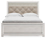 Details Includes queen upholstered panel headboard, footboard, platform rails and roll slats, Made with engineered wood (MDF/particleboard) and decorative laminate, Light finish with subtle pearl effect over replicated cedar grain with authentic touch, Gray polyester upholstery with faux crystal button tufting, Glitter panel accent, Faceted chrome-tone accents, LED light strip with remote-controlled color and brightness options, Included remote holder discreetly keeps light remote accessible, Power cord included; UL Listed, Mattress available, sold separately, Bed does not require a foundation/box spring, Assembly required, Bed is compatible with an adjustable base