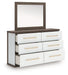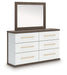 Looking to make a subtly striking statement in your bedroom? We've got you covered. A sophisticated two-tone treatment on this dresser with mirror marries a warm brown finish over replicated walnut grain with a matte white finish. The dresser's rounded corners and thick top radiate an air of modern panache, while sleek handles in a champagne finish add a sparkling touch to the spacious drawers. It’s a master class in contemporary yet comfortable character.