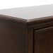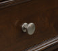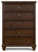 Details Made with hardwood solids, birch veneer and MDF substrate, Brownish cherry finish, 5 smooth-gliding drawers with dovetail construction and ball-bearing side glides, Round metal drawer knobs with satin nickel-tone finish, Tapered feet, Framed drawer fronts