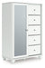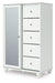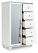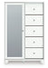 Details Made with engineered wood (MDF/particleboard/plywood) and decorative laminate for the right balance of affordability and durability, Matte white finish, Decorative laminate replicates natural or man-made material surfaces with consistent color, pattern and texture, Crystal drawer knobs, 5 smooth-operating drawers, Drawer interiors are lined with a faux linen laminate for a clean, finished look, 3 shelves behind mirrored cabinet door; middle shelf is adjustable, Safety is a top priority, clothing storage units are designed to meet the most current standard for stability, ASTM F 2057 (ASTM International), Drawers extend out to accommodate maximum access to drawer interior while maintaining safety