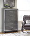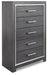 Details Made of engineered wood (MDF/particleboard) and decorative laminate, Gray finish with replicated wood grain, Faceted chrome-tone pulls and accents, 5 smooth-operating drawers, Drawer interiors are lined with a faux linen laminate for a clean, finished look, Safety is a top priority, clothing storage units are designed to meet the most current standard for stability, ASTM F 2057 (ASTM International), Drawers extend out to accommodate maximum access to drawer interior while maintaining safety