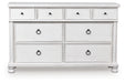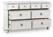 Taking a laid-back approach to casual traditional design, this artfully crafted dresser combines classic elements with a clean modern approach. Its rubbed antiqued white finish exudes a comfy, timeless appeal that's sure to carry you away to a dreamy time and place. Simple round metal knobs and ring pulls on the dresser's spacious drawers make just the right statement.