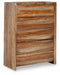 Details Made with sheesham wood, veneer and MDF substrate, Clear natural wood-tone finish, Front frame with thick beveled edge, 5 smooth-gliding drawers with fully finished interior, dovetail construction and heavy duty ball-bearing side glides