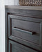 This door chest is casual contemporary style simply done right. Its two-tone color scheme features a rich brushed black main color accented with a beautiful dusty grayish brown wood tone. And there's plenty of storage to accommodate your wardrobe needs with ease. The dresser has 5 soft-close drawers, and behind the door you'll find pull-out trays for shoes or other accessories, along with shelving for bulky items.