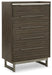 Clean lines lend sophistication and structure to this bedroom package. A complex rich grayish brown finish creates visual interest and adds to the contemporary vibe.