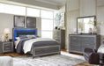 | Details | B214B1: Made of engineered wood (MDF/particleboard) and decorative laminate, Gray finish with replicated wood grain, Faceted chrome-tone pulls and accents, 6 smooth-operating drawers, Drawers lined with faux linen laminate, Mirror attaches to back of dresser, Includes tipover restraint device, Assembly required, B214B2: Includes headboard, footboard and side rails, Made of engineered wood (MDF/particleboard) and decorative laminate, Gray finish with replicated wood grain, Faux leather upholstery, Faux crystal and faceted chrome-tone metal accents, Accent LED lights with remote to control color and brightness, Power cord included; UL Listed, Foundation/box spring required, sold separately, Mattress available, sold separately, Assembly required, Bed is compatible with an adjustable base, | |