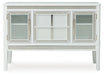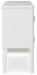 Details Made with solid wood components, MDF substrate and decorative PVC laminate, Bright white lacquer finish, 2 felt-lined drawers with fully finished interior, dovetail construction and ball-bearing side glides, 2 glass-front cabinets, each with adjustable shelf, Brushed champagne metal pulls, Rhinestone and textured PVC accents, LED accent lighting, Power cord included; UL Listed, Assembly required