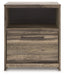 Casually cool style and lots of storage go hand in hand with this nightstand. A weathered brown finish over replicated oak grain creates an easygoing vibe, setting the scene in your restful retreat. The nightstand's clean lines and modern handles provide a fuss-free look. You’ll find its drawer and cubby to be spacious, and the USB charging keeps up with your high-tech lifestyle.