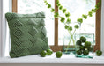 | Details | Polyethylene terephthalate cover, Handwoven geometric design in green, Solid green reverse, Fiber filled, Zipper closure, Made for indoor/outdoor use, Imported, Spot clean only | |