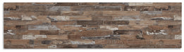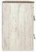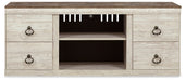 Details Made of engineered wood (MDF/particleboard) and decorative laminate, Replicated whitewash worn through paint, Top with replicated wood grained block pattern with authentic touch, Ring pull hardware in antiqued brass-tone finish, Center open storage area; 2 side storage areas with cabinet doors, Cutouts for wire management and ventilation, Compatible with W100-101 LED fireplace insert (sold separately), Assembly required