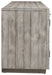 Details Made of pine wood, pine veneer and engineered wood, Weathered light gray finish, 2 side cabinets each with single adjustable shelf, Fixed open center shelf, 3 open cubbies, Cutouts for wire management, Power cord included; UL Listed, Assembly required