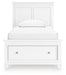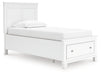 Details Includes panel headboard, storage footboard, rails and roll slats , Made with hardwood solids and MDF substrate, Side rails feature laminated solid hardwood slat support rails (or LVL) with glued and screwed blocking for added strength , White painted finish, Round metal drawer knob with satin nickel-tone finish, Tapered feet, Smooth-gliding drawer in footboard , Bed does not require additional foundation/box spring; accommodates most zero clearance adjustable bases with the addition of a bunkie board , Mattress available, sold separately, Assembly required