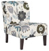 This fashion-forward accent chair adds a cool vibe to your home. Armless design is perfect for small spaces that need a spark of color. The ivory, blue, charcoal and brown floral-patterned upholstery will brighten your space and bring in an element of comfort.