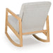 This accent chair is an easygoing beauty. Its sleek rocking chair profile with solid wood legs is perfect for living rooms, nurseries or any space where you want to relax and unwind. And with easy-to-clean Next-Gen Nuvella™ fabric, upkeep is a breeze.