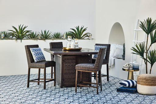 Signature Design by Ashley®Easy-breezy beauty, made to withstand the elements. This outdoor bar table with fire pit makes a serene statement with its soothing shade of blue a...