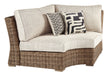 | Details | Includes 3 armless chairs with cushions, curved corner chair with cushion, left-arm facing loveseat and right-arm facing loveseat, "Left-arm" and "right-arm" describe the position of the arm when you face the piece, All-weather resin wicker handwoven over powder coated rust-proof aluminum frames, Throw pillows included, Zippered cushions and throw pillows covered in high-performing Nuvella® fabric, All-weather foam cushion core wrapped in soft polyester, Clean fabric with mild soap and water, let air dry; for stubborn stains, use a solution of 1 cup bleach to 1 gallon water, Imported fabric and fill, Assembly required | |