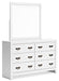 | Details | Includes dresser and mirror, Made with hardwood solids, okoume veneer and MDF substrates, White finish, 6 drawers with dovetail construction and metal center guides, Hardware with dark finish, Drawer interiors are lined with a wood grain laminate for a clean, finished look, Mirror attaches to back of dresser | |