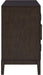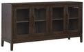 Dressed to thrill, this simply stunning dining server offers a high-design look at a down-to-earth price. Ultra sleek lines are accentuated with a dark waxy brown oak-tone finish that’s so easy on the eyes. Custom bar pulls on the double-door cabinets emphasize the server's clean, modern lines, while their brass-tone finish and metal accents in the same coloration complete the upscale aesthetic. Beautiful inside and out, glass front doors showcase the adjustable shelving to create a display and storage piece with a timeless look that's made to last.