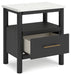 | Details | Made with engineered wood (MDF/particleboard/plywood) and decorative laminate for the right balance of affordability and durability, Matte black finish with subtle replicated wood grain, Replicated white marble top, Decorative laminate replicates natural or man-made material surfaces with consistent color, pattern and texture, Handles with light bronze-tone finish, 1 smooth-gliding drawer, Drawer interior is lined with a faux linen laminate for a clean, finished look, Open shelf, USB and Qi wireless charging options, Ambient lighting under the top, Power cord included; UL Listed, Minor assembly required | |