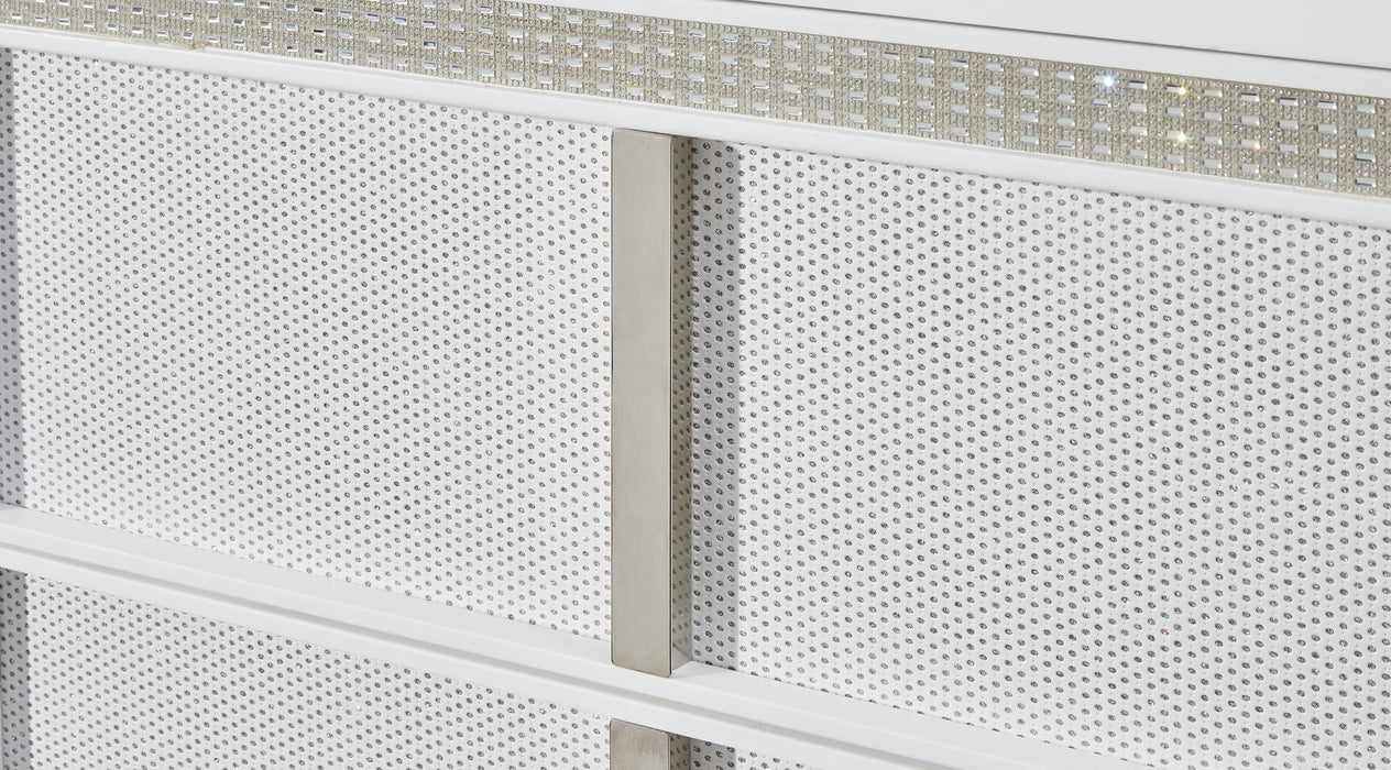 | Details | Includes queen upholstered headboard, storage footboard, rails and roll slats, Made with solid wood components, MDF substrate and decorative laminate, White lacquer finish, Vertical metal drawer pulls, Faux leather upholstery, Built-in LED lighting with 3-way dimmer switch, 2 drawers with fully finished interior, dovetail construction and ball-bearing side glides, Drawers with rhinestone frames; textured laminate drawer fronts, Power cord included; UL Listed, Bed does not require additional foundation/box spring; accommodates most zero clearance adjustable bases with the addition of a bunkie board, Mattress available, sold separately, Assembly required | |
