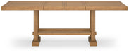 Details D773-32: Made with rubberwood solids, distressed pine veneers and MDF substrates, Distressed light brown pine finish, Double trestle base, Seats up to 10, 2 removable center leaves, Table extends by pulling both ends and dropping in leaf, Solid wood stretcher, Assembly required, D773-124: Made with wood, Distressed light brown pine finish, Foam cushion with textured polyester upholstery, Assembly required,
