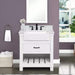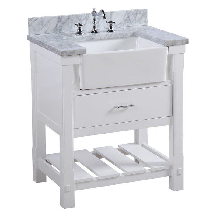 Trendy and timeless, this bathroom vanity set in a high end furniture style will revamp your bath or powder room. It is 100% Solid wood and ships fully assembled. Soft closing drawers add extra storage options, an open shelf adds ample storage and decorative space. The vanity is topped with an authentic Carrara marble countertop, 3/4" thick with a 4" high backsplash. The vanity top is pre-drilled for standard 8" widespread faucet.