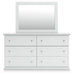 | Details | B139B47: Includes panel headboard/footboard and rails, Made with engineered wood (MDF/particleboard/plywood) and decorative laminate for the right balance of affordability and durability, Replicated solid white paint, Decorative laminate replicates natural or man-made material surfaces with consistent color, pattern and texture, Foundation/box spring required, sold separately, Mattress available, sold separately, Assembly required, B139B40: Includes dresser and mirror, Made of engineered wood (MDF/particleboard), Knobs with pewter-tone finish, Scalloped moulding, 6 smooth-operating drawers, Includes tipover restraint device, Mirror attaches to back of dresser; can also be mounted on wall horizontally or vertically, Safety is a top priority, clothing storage units are designed to meet the most current standard for stability, ASTM F 2057 (ASTM International), Drawers extend out to accommodate maximum access to drawer interior while maintaining safety, | |