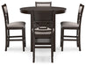 | Details | Includes counter height dining table and 4 upholstered bar stools, Table made with rubberwood solids, mindi veneer and MDF substrates, Stool made with solid wood and engineered wood, Cherry brown finish, Tabletop has reverse diamond patterned veneer, Thick tapered legs, 2 lower shelves, Stool with light beige polyester upholstery, Foam cushion seat and backrest, Stool backrest features fretwork accent, Seats up to 4, Assembly required | |