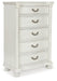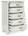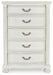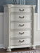 Details Made with hardwood solids, veneer and MDF substrate with cast resin components, Antiqued white finish, Metal pulls with polished pewter-tone finish, 5 smooth-gliding drawers with fully finished interiors, Drawers with French/English dovetail construction and heavy-duty ball-bearing side glides (top drawer felt lined), Thick decorative moulding, Reeded bun feet