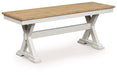 Busy breakfasts and family dinners get a dose of modern farmhouse flair with this dining bench. Its two-tone finish contrasts a light butcher block hue with antiqued white for an utterly charming effect. An effortless seating solution, the bench can tuck under your table to give you extra space to maneuver through the dining room.