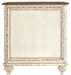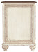 Elevating the art of traditional cottage styling, this chairside end table is sure to serve you beautifully for years to come. Antiqued two-tone aesthetic blends a chipped white with a distressed wood finished top for added charm. Cabinet door features inset mirror with filigree moulding for a fanciful twist.