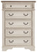 Elevating the art of traditional cottage styling, this chest of drawers is your dream bedroom retreat realized. Its antiqued two-tone aesthetic blends a chipped white with a distressed wood finished top for added charm. Framed drawer fronts and decorative corbels add refinement, while bail pulls in a dark bronze-tone finish lend a classic touch.