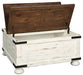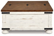 Double take. Sporting a two-tone finish, dual-sided lid design and expansive storage space, this square coffee table takes the art of rustic farmhouse living to a new level. Designer touches include plank-effect styling, heavy distressing and industrial bracket hardware.